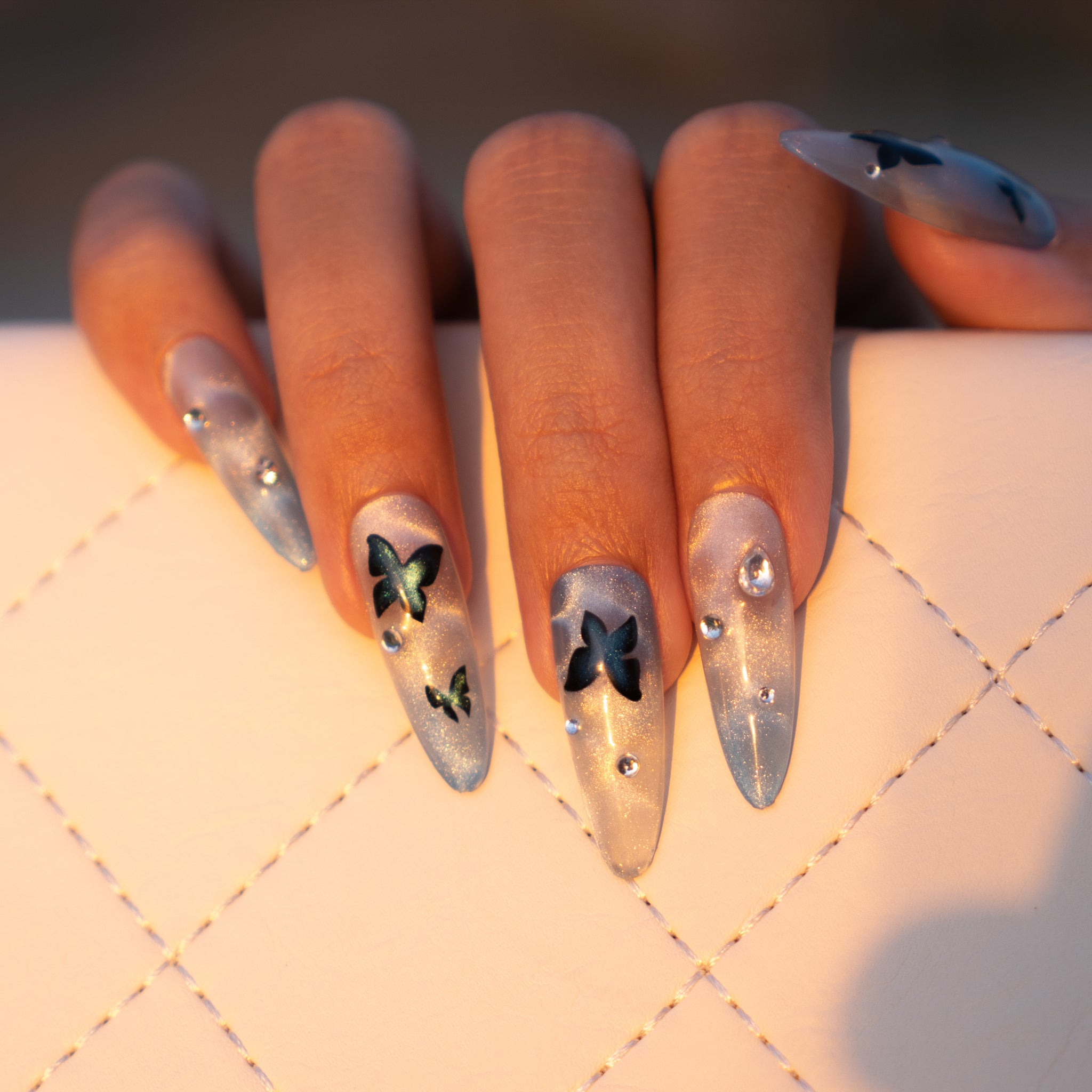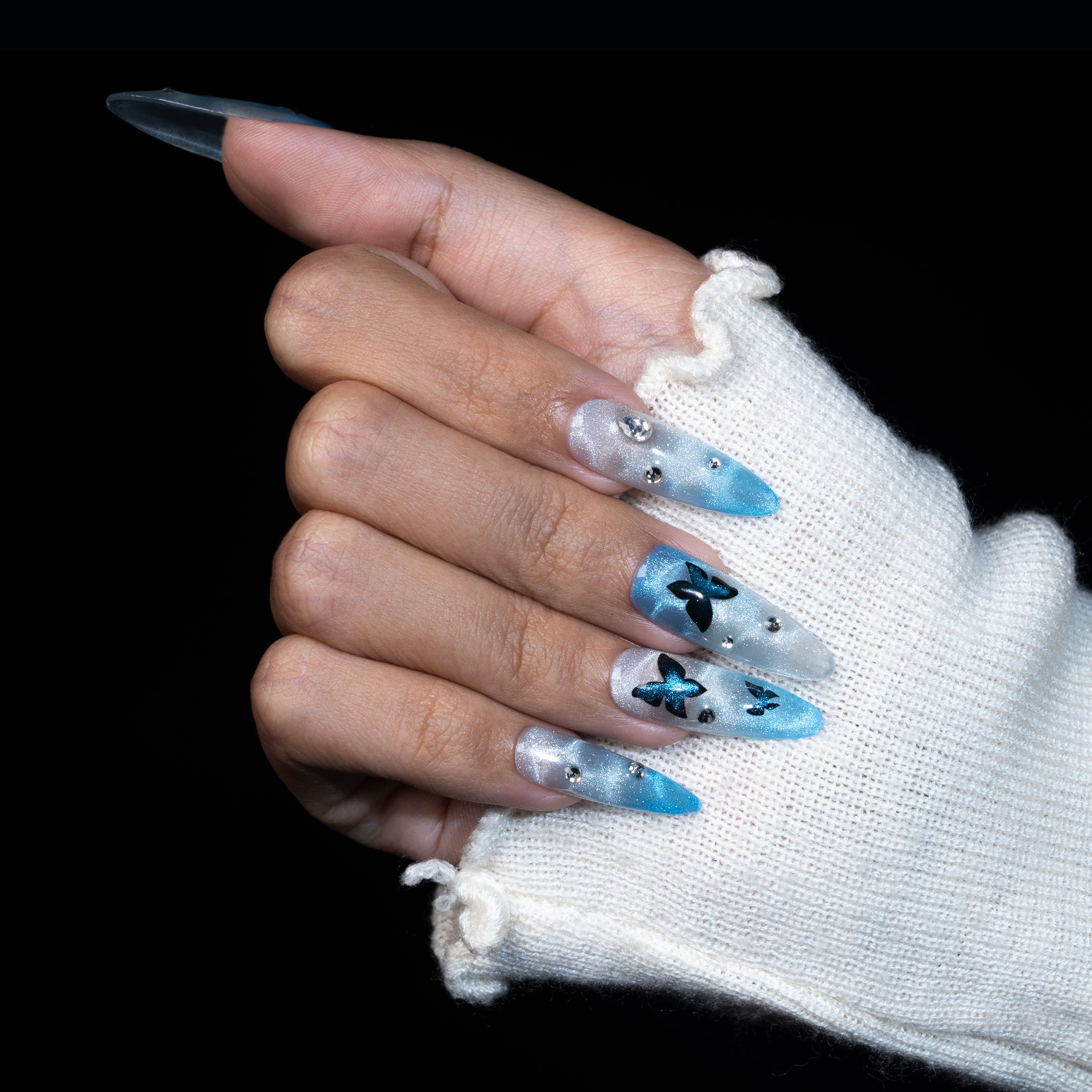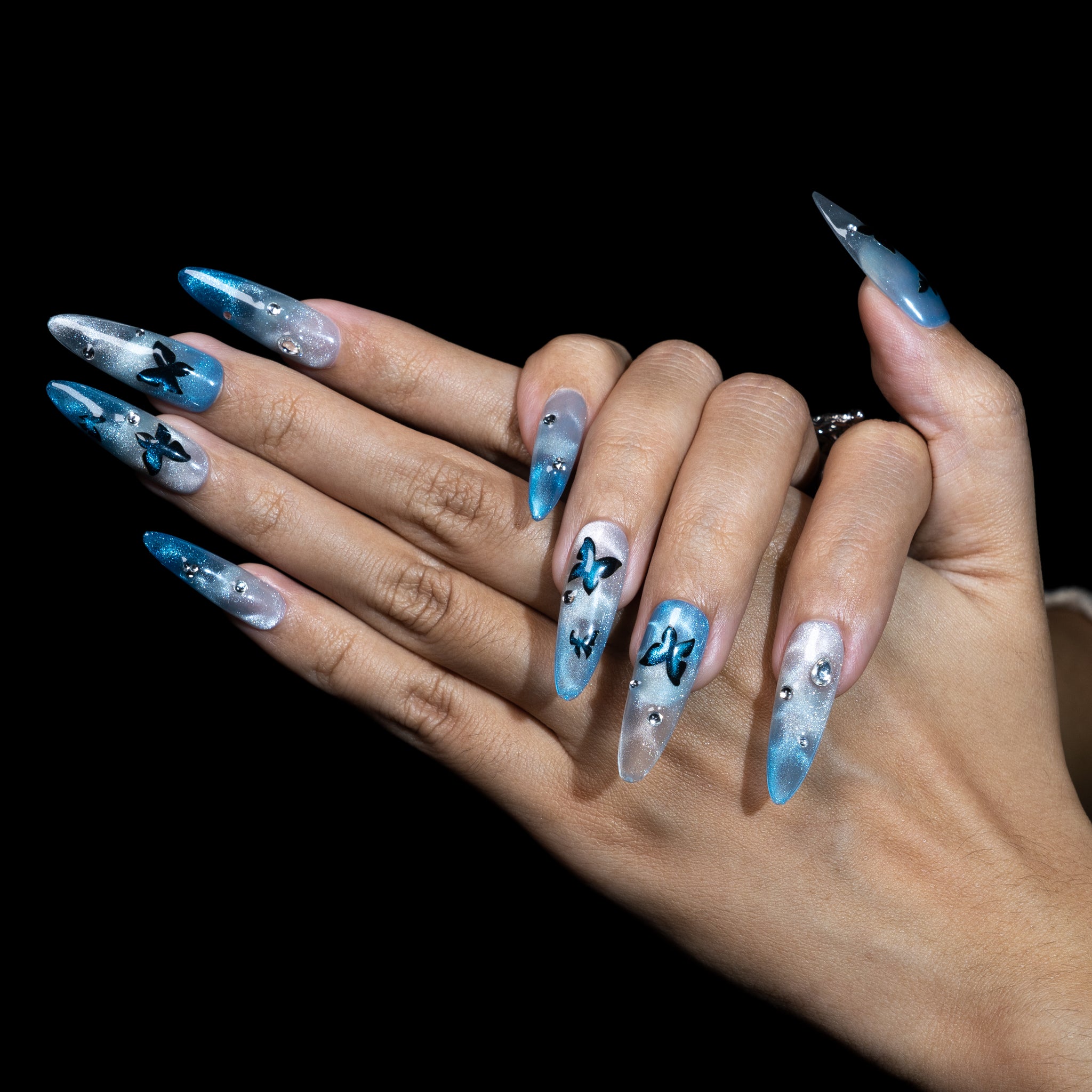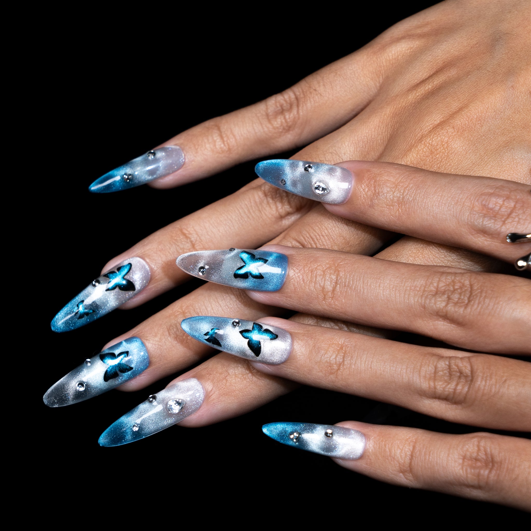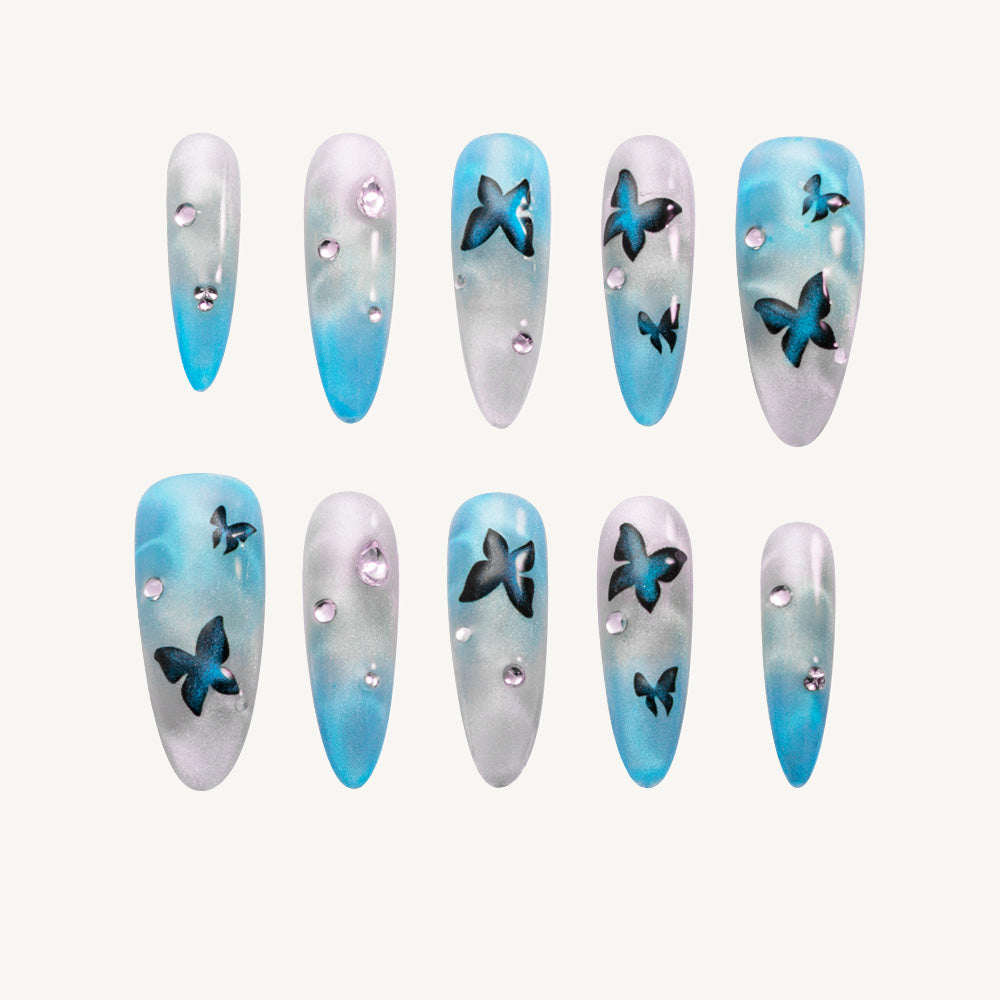Sur un fond réalisé en un dégradé fusionnant un bleu lac clair et un blanc, qui rappelle la surface miroitante d'un lac. Des motifs de papillons, dessinés avec un effet œil de chat bleu foncé, s'égrènent avec grâce sur l'ongle, tandis que des strass scintillent tels des reflets à la surface de l'eau.