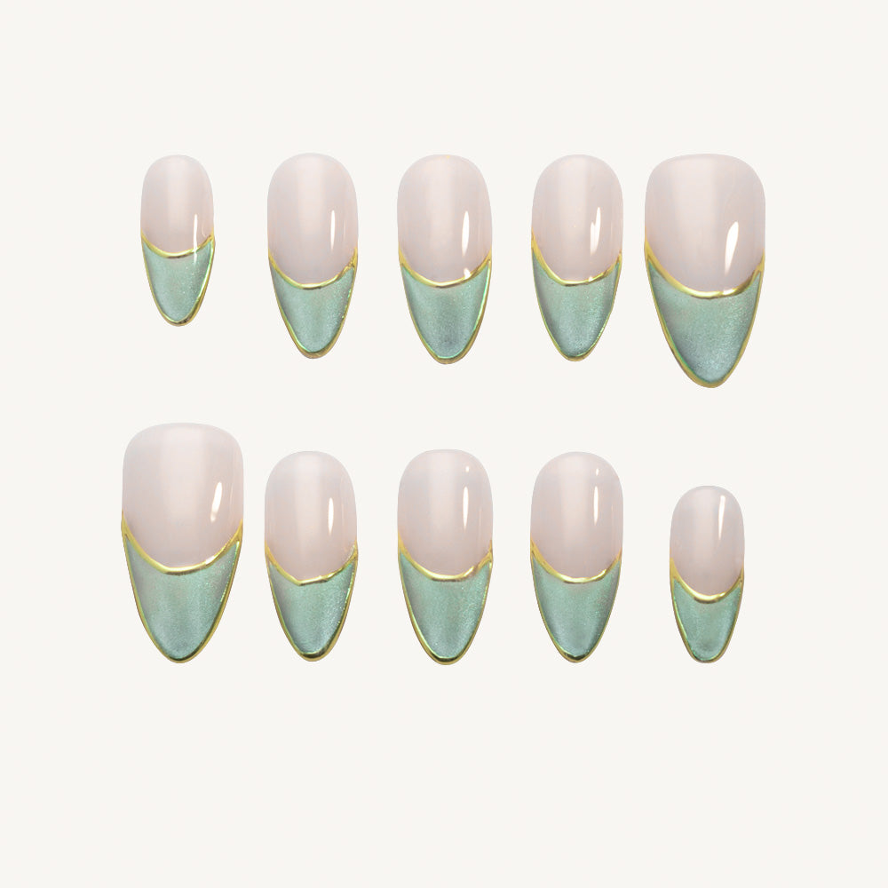 A base of tallow white, as if enveloped in a silky light. Its lower half presents a jade green cat's-eye effect, with a softness and depth typical of precious stones , while a fine gold border traces its outline with perfect precision.