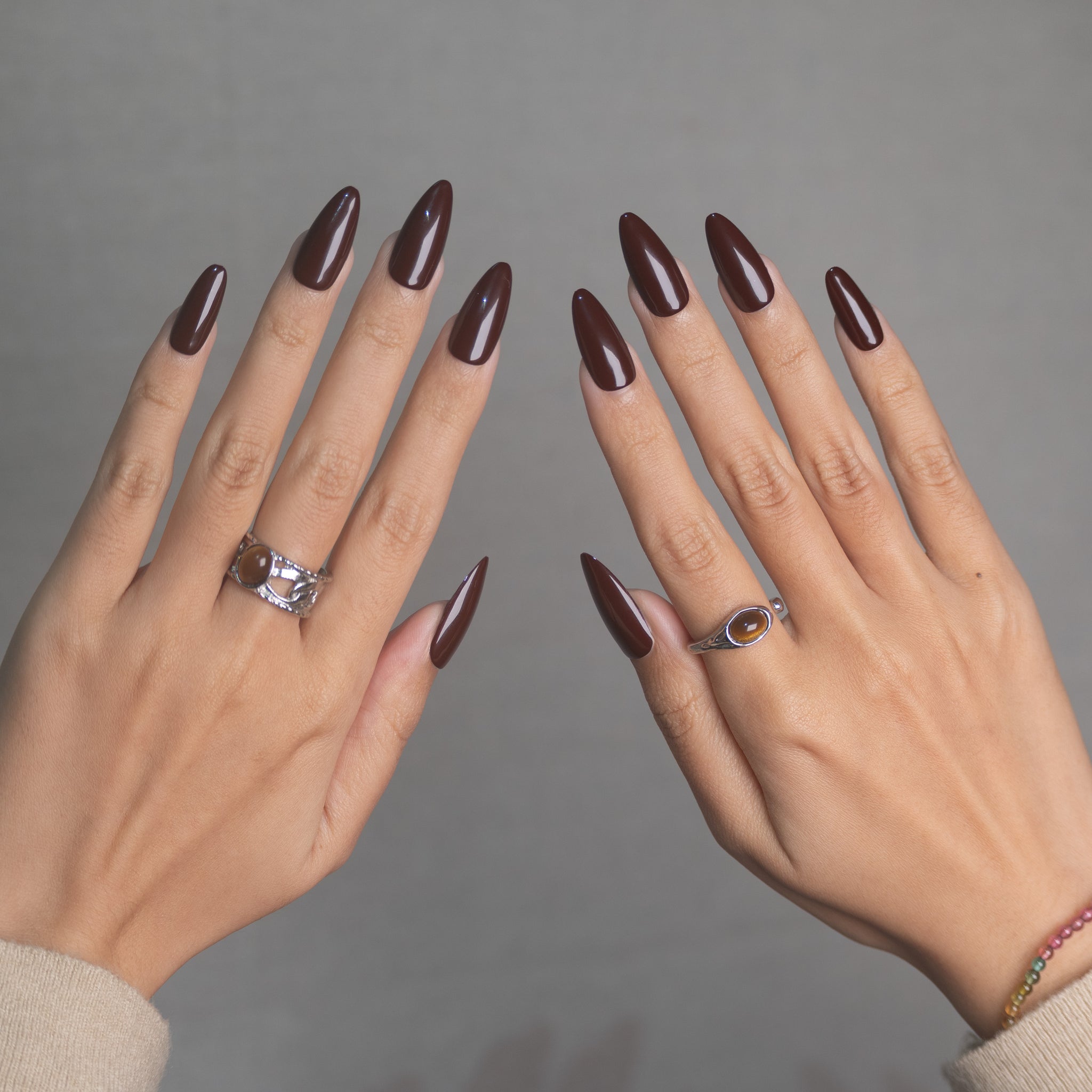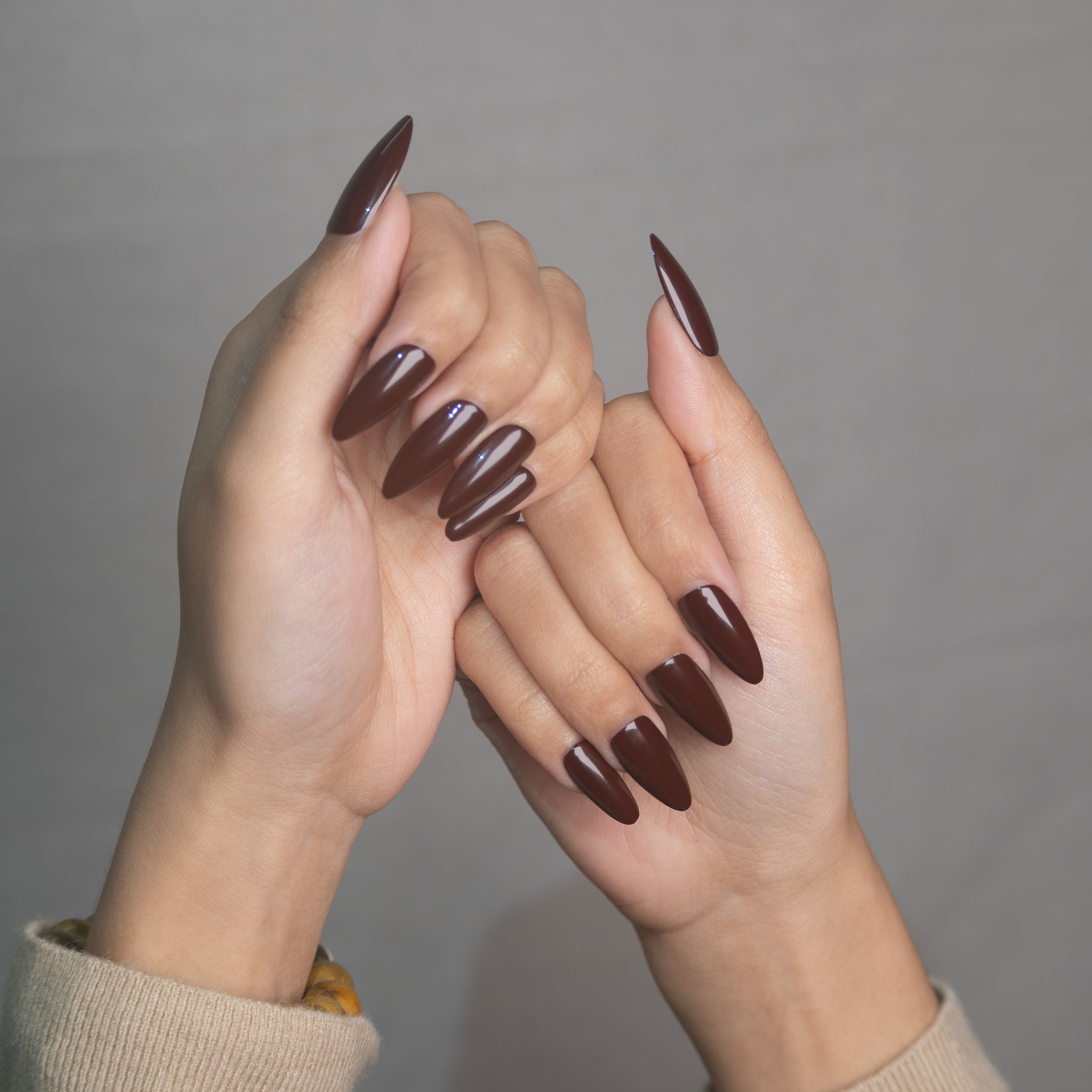 Un Brun Cacao intense et velouté. Recouverte d'une brillance généreuse, elle évoque le nappage d'un chocolat chaud sur l'ongle, diffusant une atmosphère rétro et douillette propre aux saisons froides.
