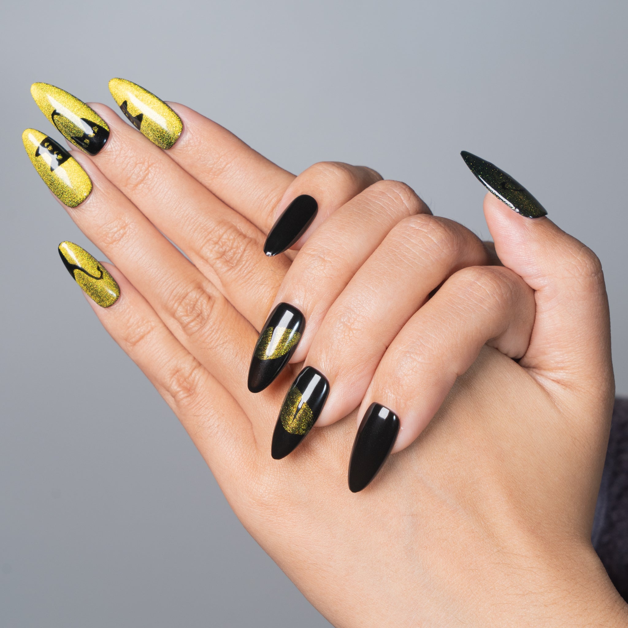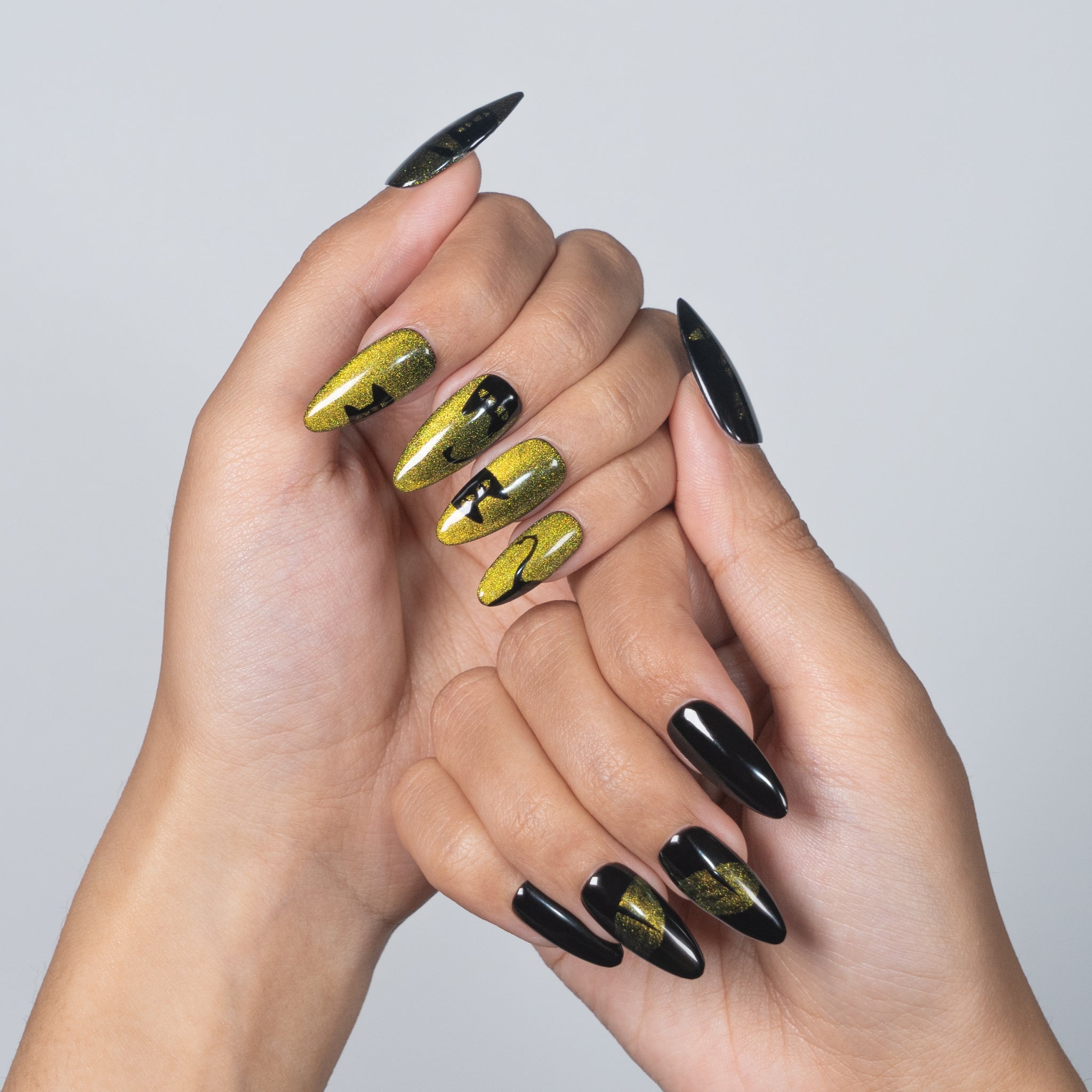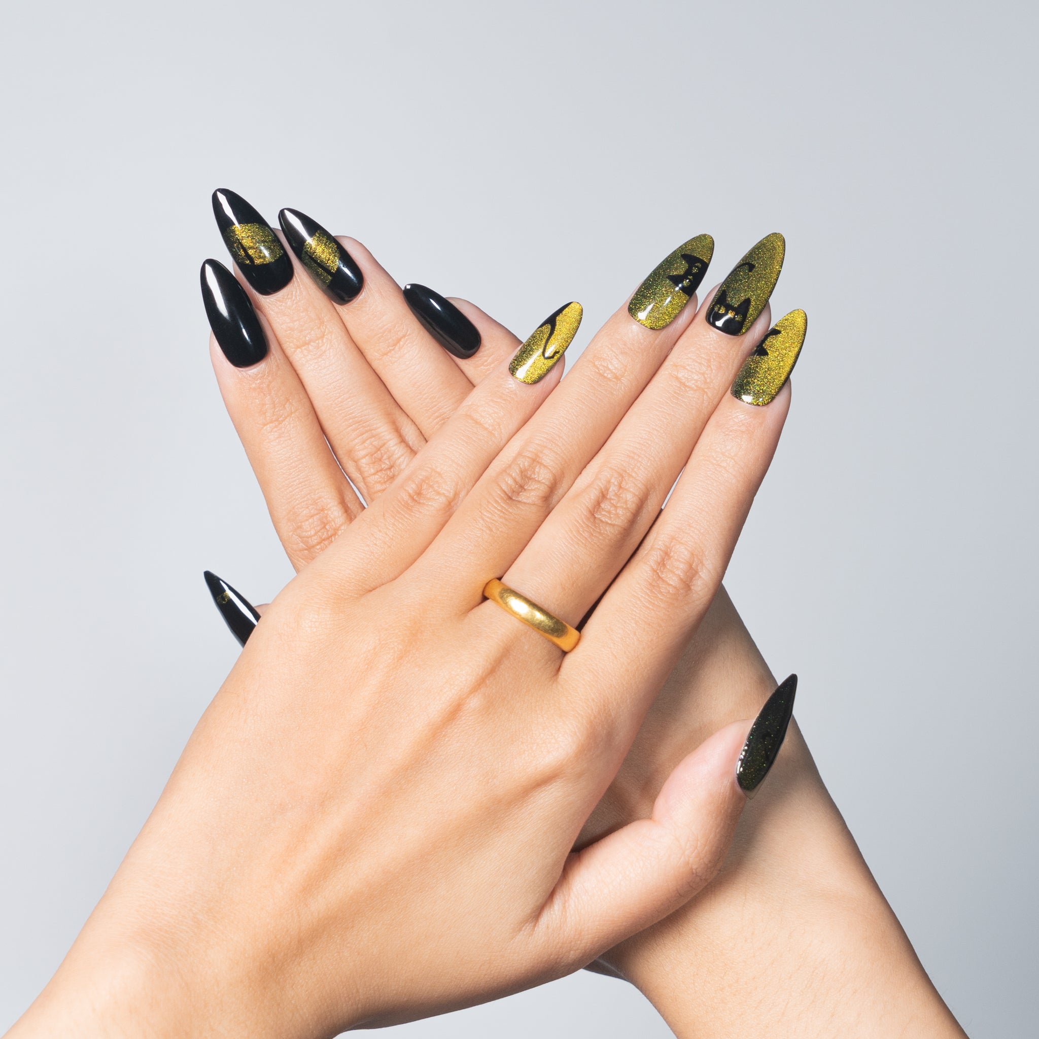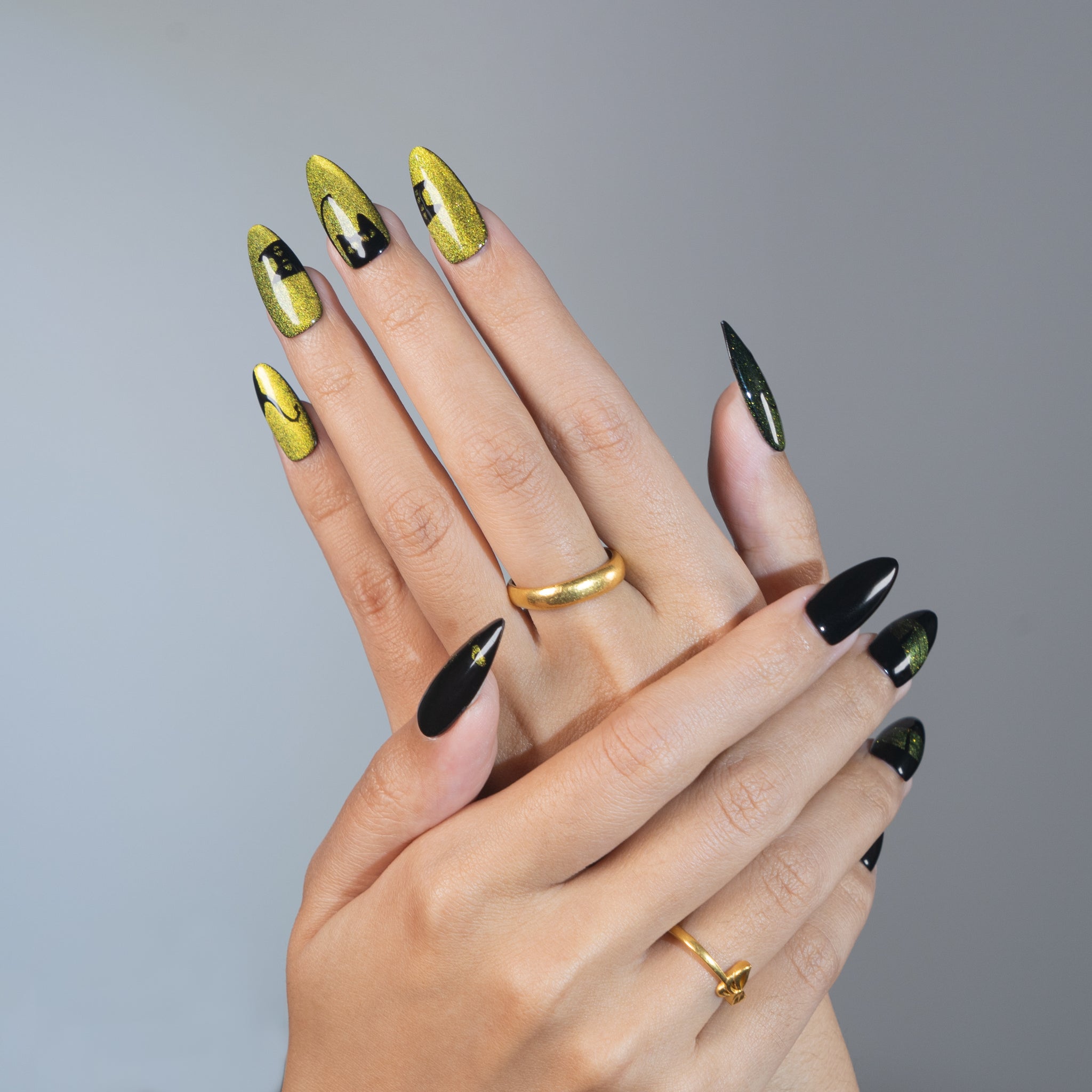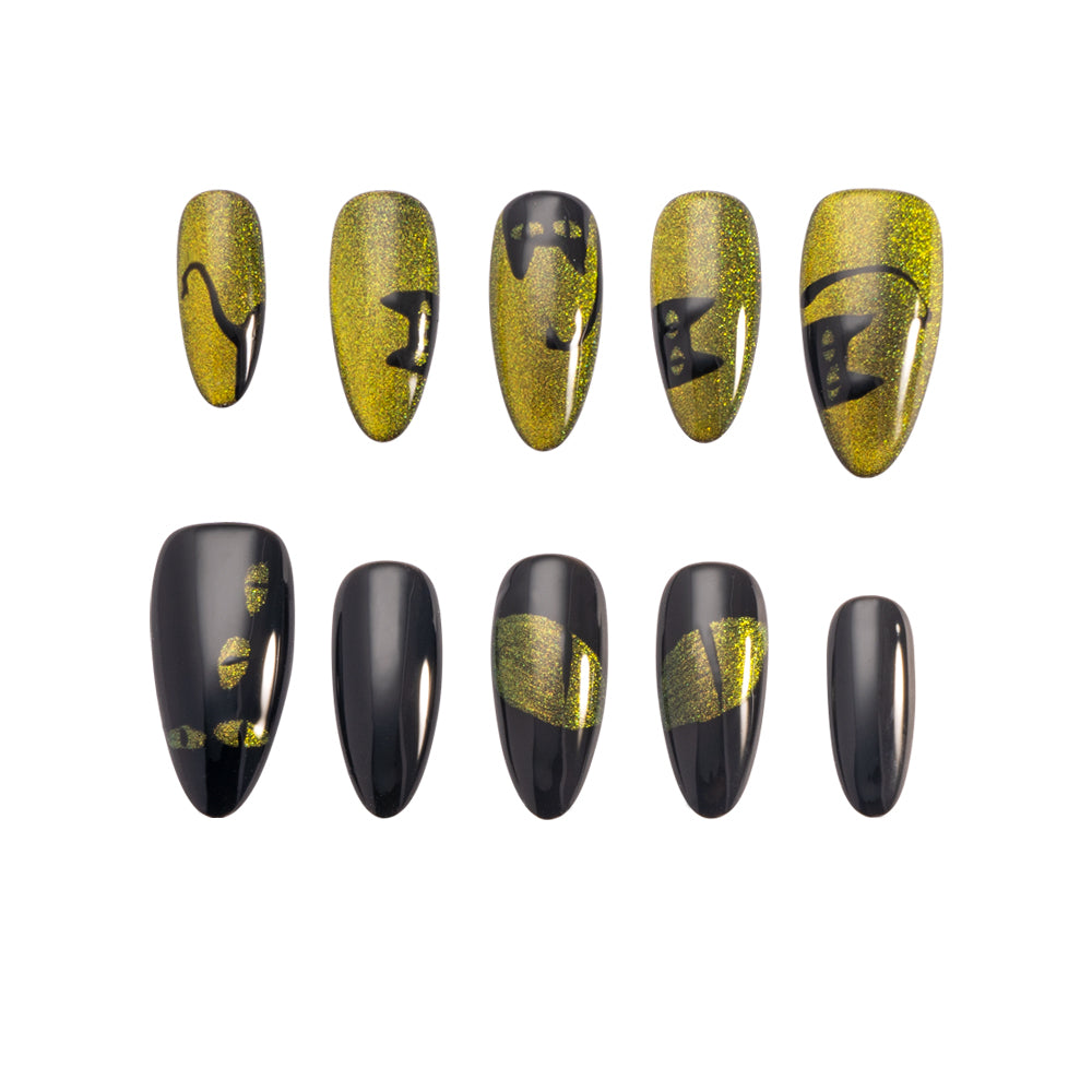 Alliant un effet œil de chat vert-jaune et un noir profond, le tout comme enveloppé d'un sortilège de lune. Des chats aux attitudes variées prennent vie sur l'ongle. Les yeux félins, dessinés avec des paillettes, allient profondeur et vivacité, créant une atmosphère de fantaisie ludique teintée de mystère.