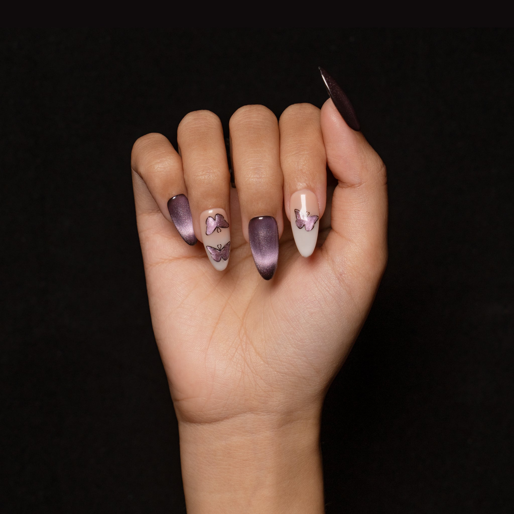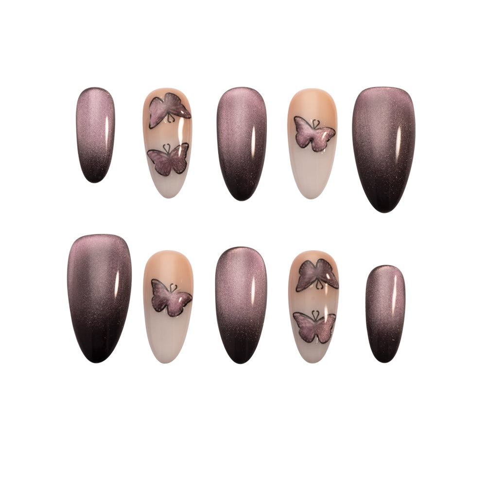 Sur une base conjuguant un dégradé de mauve et un dégradé de nude, de fines paillettes créent un halo de lumière vaporeuse. Des papillons, telles que des silhouettes chimériques issues d’un songe, y prennent place.