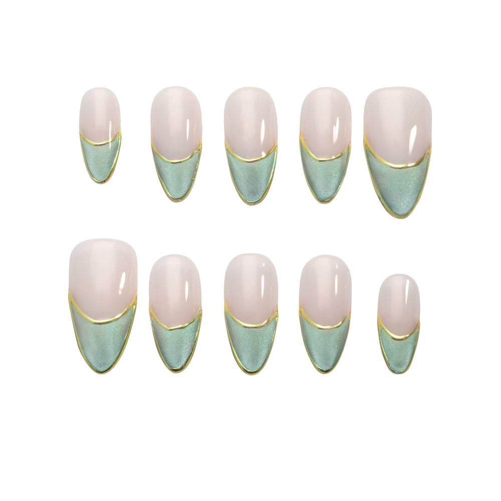 Une base d’un blanc de suif, comme enveloppée d’une lumière soyeuse. Sa moitié inférieure présente un effet œil-de-chat vert jade, d’une douceur et d’une profondeur typiques des pierres précieuses, tandis qu’un fin liseré doré en dessine le contour avec une précision parfaite.